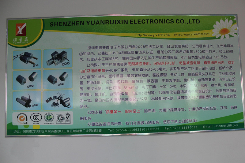 深圳市圓睿鑫電子有限公司自2008年創(chuàng)立以來,經(jīng)過誠信耕耘,在為期兩年的時間內(nèi),已通過ISO9001:2000國際質(zhì)量體系認(rèn)證。公司廠房占地面積2000多平方米,員工100人,專業(yè)技術(shù)工程師6名,擁有國內(nèi)最先進(jìn)的生產(chǎn)和檢測設(shè)備,年產(chǎn)各類減速電機超過2~300萬臺。因公司發(fā)展需要,于2020年底,將生產(chǎn)基地遷往擁有最美小鎮(zhèn)之稱的東莞市清溪鎮(zhèn),依山傍水,依托美麗的大自然環(huán)境和地方文化,全新的東莞市圓睿鑫電子有限公司將借助深圳母公司平臺,一步步走上新的臺階。 東莞公司將繼續(xù)致力于生產(chǎn)銷售各類無刷減速電機 渦輪渦桿電機,微型減速電機,直流減速馬達(dá),交流手搖發(fā)電機、同步電機及空心杯電機等,電機直徑從6-60毫米為定位,系列產(chǎn)品廣泛用于智能家電、智能辦公自動化設(shè)備、智能醫(yī)療、美容健身器材、遙控模型、電動工具、高檔玩具以及其它工業(yè)驅(qū)動裝置,如高檔玩具、游戲機、麻將機、飄香器、手機發(fā)電機、柔巾機、自動噴霧器、汽車自動設(shè)施、電動牙刷、舞臺燈飾、圣誕產(chǎn)品、智能電子門鎖、VCD、DVD、水泵、氣泵、水表、煤氣閥、電磁閥、攪拌機、榨汁...